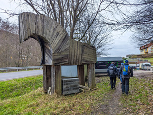 Vom Ortsausgang laufen wir noch ein kurzes Stück hinunter zu Straße, überqueren diese und treffen auf ein hölzernes Pferd. Von dort geht es nach links den Berg nach oben. Wir wandern ein Stück oberhalb von Seckmauern entlang, bevor wir nach rechts den Berg hoch laufen und den längsten Anstieg (ca. 1,5 km und 150 HM) in Angriff nehmen. Nach gut und gerne 15 minütigem kontinuierlichem Bergauftrampeln 😰, haben wir es geschafft und stehen oben. Mittlerweile haben wir auch die bayrisch-hessische Grenze übertreten und sind wieder in Bayern. Der Wegweißer führt uns jetzt nach links und wir erreichen bald die Kunradslust mit der Karlshütte. Nun geht es nur noch abwärts, bis zum letzten Waldhaus, dem "Waldhaus Diana", es "läuft" sozusagen 😉.