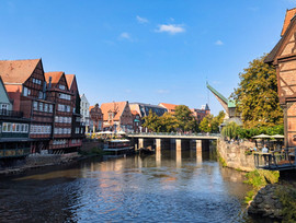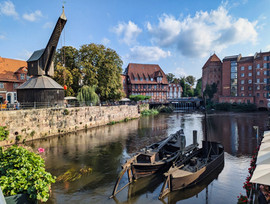 Wir laufen Richtung des historischen Platzes "Am Sande" einst Treffpunkt der Kaufleute und heute umgeben von prächtigen Giebelhäusern. Am Ende des Platzes ragt die St. Johannis Kirche hinauf. Als Nächstes gelangen wir zur Abtsmühle im Wasserviertel. Bis in die 80er Jahre des 20. Jahrhunderts wurden hier rund 60 Tonnen Getreide ausschließlich mit Wasserkraft gemahlen. Heute ist das Gebäude Teil einer bekannten Hotelanlage. Durch den Turm des Gebäudes kommen wir auf die Brausebrücke, die über die Ilmenau führt. Von hier hat man einen tollen Blick auf den Lüneburger Hafen. Nach der Brücke erreichen wir die Lüner Mühle, in der sich heute das gemütliche Restaurant Mälzer Mühle befindet. Wir beschließen, dort einzukehren. Die Sonnenterrasse liegt direkt am Fluss, mit tollem Ausblick auf den Hafen und die historischen Giebelhäuser. Als kleines i-Tüpfelchen bietet es selbst gebrautes Mälzer Bier an.