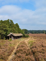 Auf einem schmalen Pfad durch die Heide wandere ich weiter. Bald erreiche ich einen breiteren Weg, auf dem die Kutschen nach Wilsede fahren. Hier biege ich links ab. Neben dem Kutschenweg gibt es wieder einen Pfad, den ich nun einschlage. Er führt unterhalb des Wilseder Berges entlang. Nach ca. 800 m biege ich in einen alleeartigen jungen Eichenwald ein. Rechts kommt bald eine Informationstafel über die Kreuzotter ins Blickfeld, die es hier offenbar noch häufig gibt. Leider hab ich nur ein bereits tote Schlange während des Aufenthaltes gesehen. Ich gehe weiter in Richtung Parkplatz Niederhaverbeck. Bald stehe ich vor einem hölzernen Aussichtsturm, der den Blick auf ein altes Fürstengrab und die Heide freigibt. In der Ferne ist der Wilseder Berg zu erkennen. Vom Turm steige ich wieder ab, ein paar Meter weiter komme ich zu einem alten Schafstall, der verträumt in der Heide liegt. Ein tolles Fotomotiv 📷! Weiter geht es durch eine schöne Heidelandschaft und zwei Baumalleen bis zum Eickhof. Diesen durchquere ich und wende mich nach links Richtung Oberhaverbeck. Kurz darauf überquere ich eine alte Steinbrücke über den Bach Haverbeeke. Über Felder und Wiesen wandere ich zurück zur FeWo, die ich oberhalb des Heidehofes erreiche.