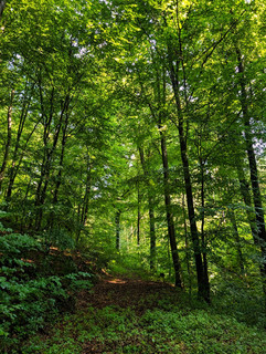Bald erreiche ich das Tal des plätschernden Dreisbachs. Am Wegrand entdecke ich einige Feldahorne – bei uns im Spessart eher selten, hier dagegen häufiger zu finden. Nach einem Stück entlang des Bachs zeigt mir Komoot, dass ich links abbiegen soll – doch dort ist nichts: kein Weg, kein Schild, nur ein Schotterberg. Also rauf da! Dahinter finde ich tatsächlich den Pfad, der sich nun durch das nächste Urwaldprojektgebiet schlängelt.